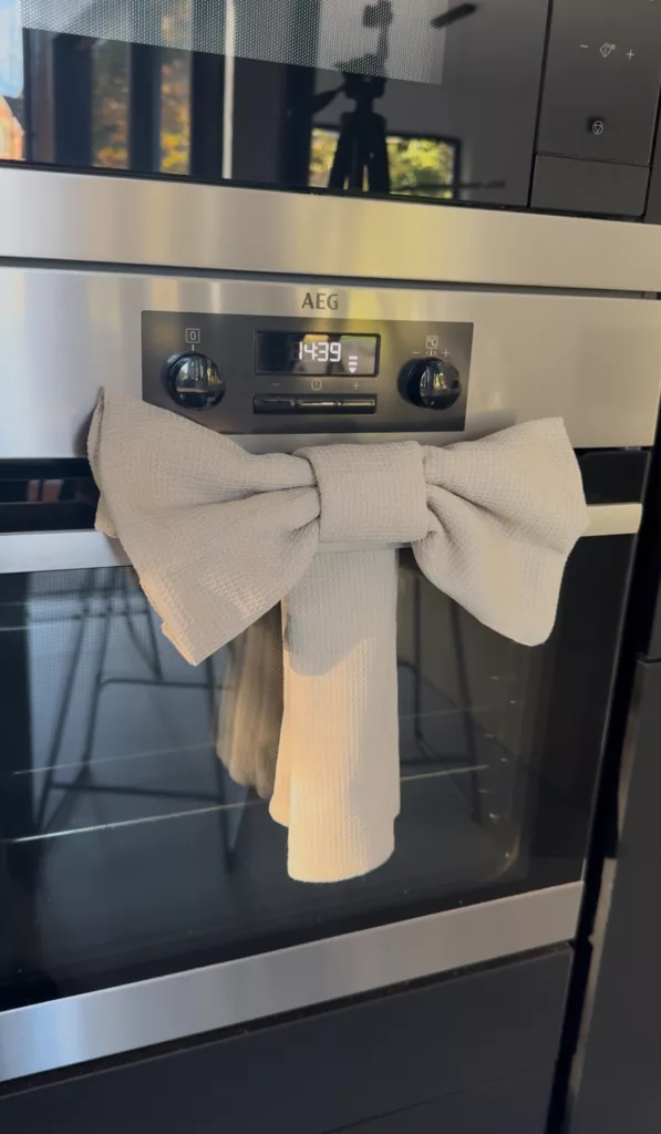 Pour terminer, j’ai plié deux essuies de cuisine ensemble pour en faire un grand nœud décoratif à accrocher sur la porte du four. C’est ultra simple à faire, et ça donne un look festif à la cuisine sans en faire trop !